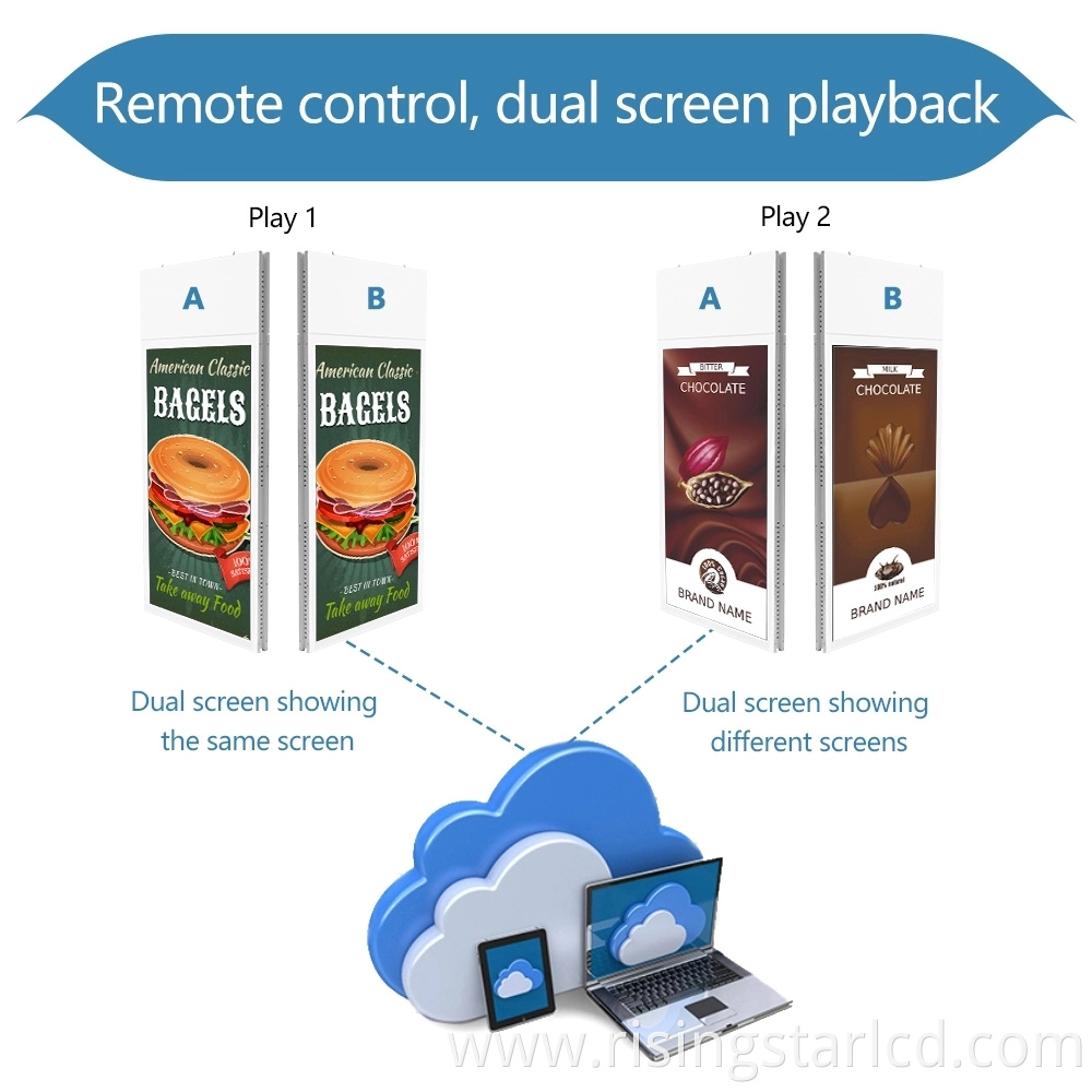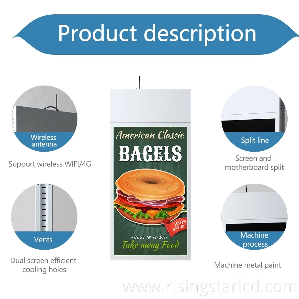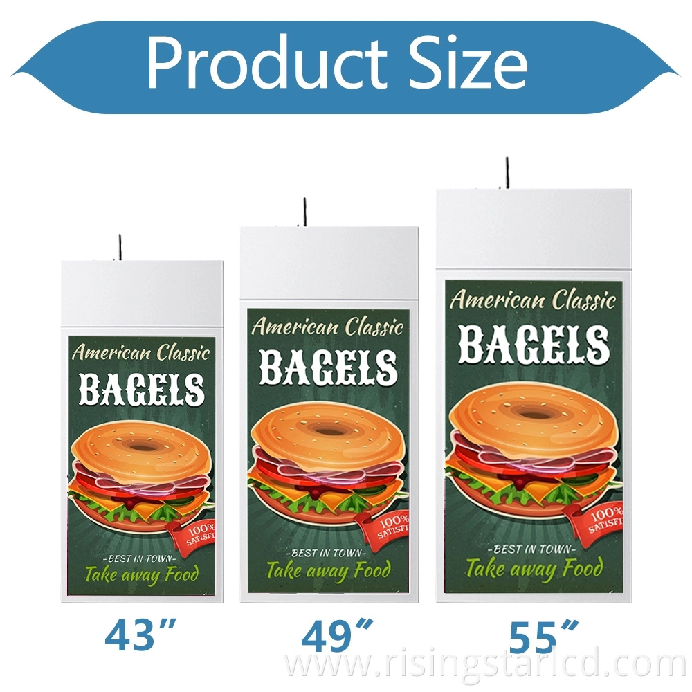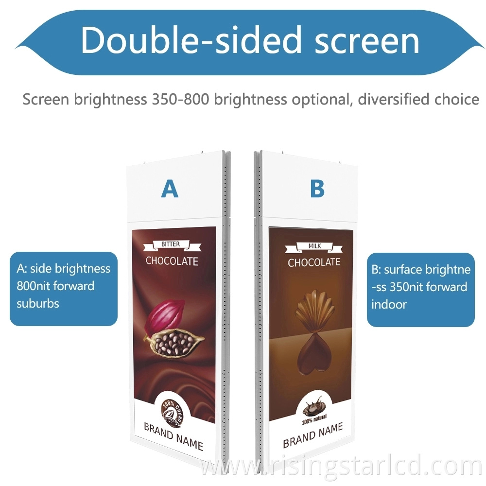 Daylight visiable display with vertical and horizontal display optional.It can be installed inside the shop store.retails,shopping mall . Hanging window display with the special heat dissipation process can reduce the noise of the panel in use, so as to achieve the mode of low power consumption, low noise and high-definition picture .