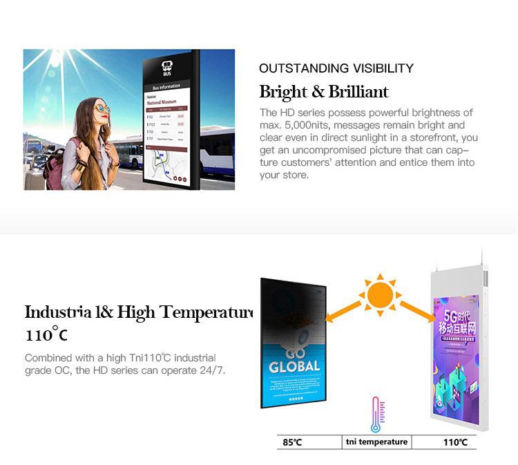 The Outdoor TV is equipped with an advanced High Brightness Lcd Display, perfect for outdoor installation needs. Its built-in innovative cooling system improves operating efficiency and keeps the TV stable without the need for additional heating or air conditioning. In terms of design, this TV uses an ultra-thin body, which is not only beautiful, but also greatly saves installation space.
