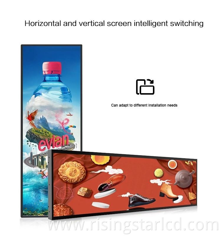 Supermarket Shelf LCD Advertising Display ,23 inch Ultra Wide Monitor Screen Stretched Bar Type LCD Advertising Display.shelf LCD advertising display use Stretch LCD Display monitor,The brithtness 500 nits,This modle support time-scheduled programs according to the customer requirement. Support horizontal and vertical displays.