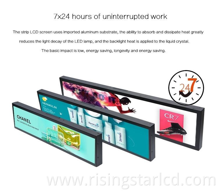 *Bar LCD advertising display built-in industrial power, low energy consumption, high level of safety protection, with power failure protection and short circuit protection.